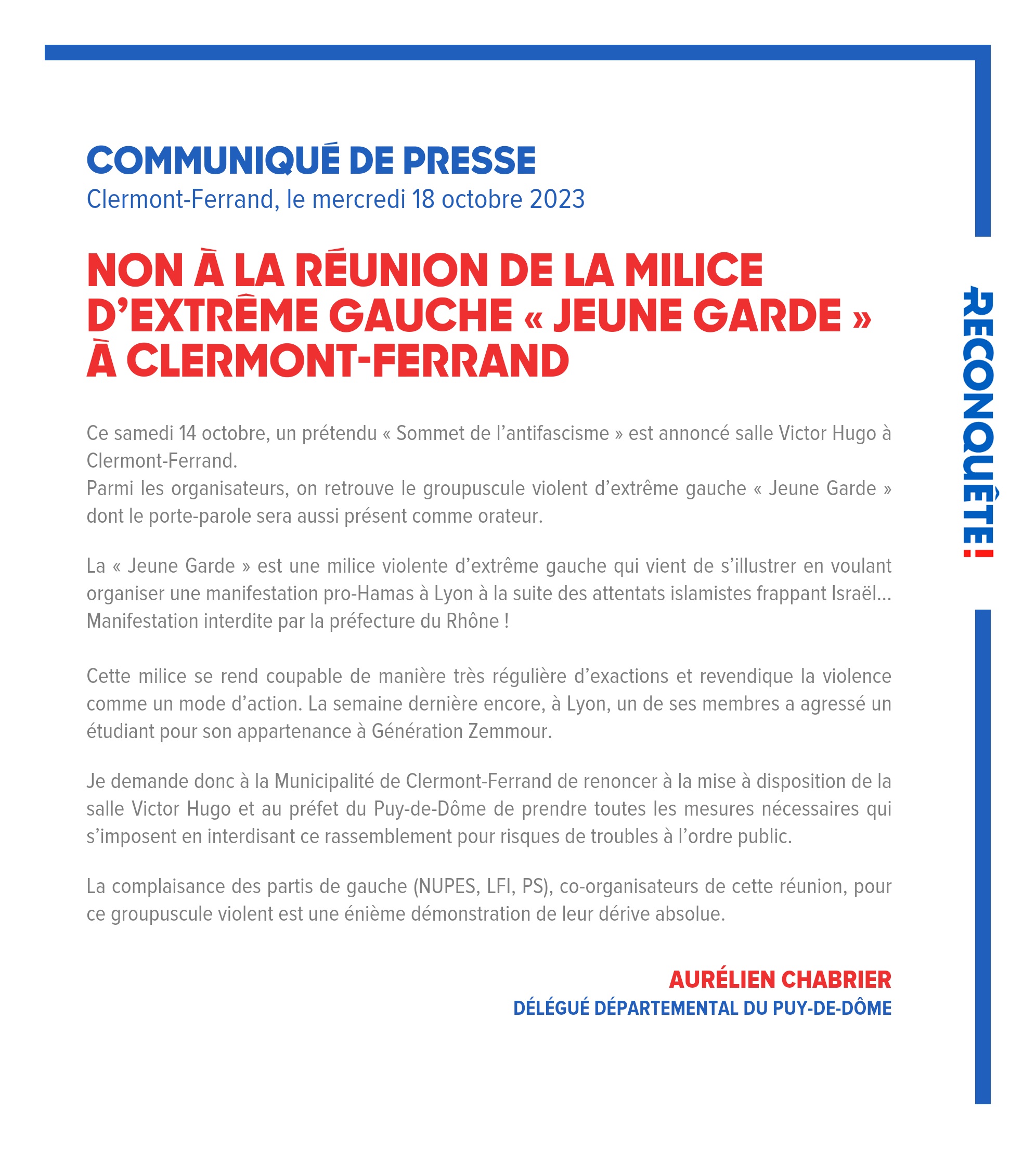 Je demande donc à la Municipalité de Clermont-Ferrand de renoncer à la mise à disposition de la salle Victor Hugo et au préfet du Puy-de-Dôme de prendre toutes les mesures nécessaires qui s’imposent en interdisant ce rassemblement pour risques de troubles à l’ordre public.